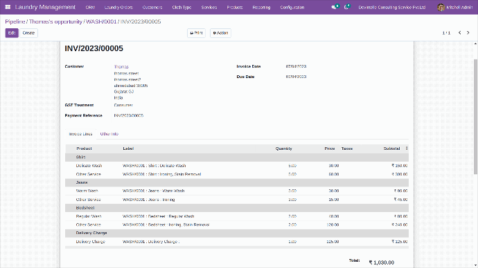 Each washing service is linked with corresponding service products. This integration ensures that every service performed is accurately recorded and invoiced, the billing process and operational transparency in laundry operations.